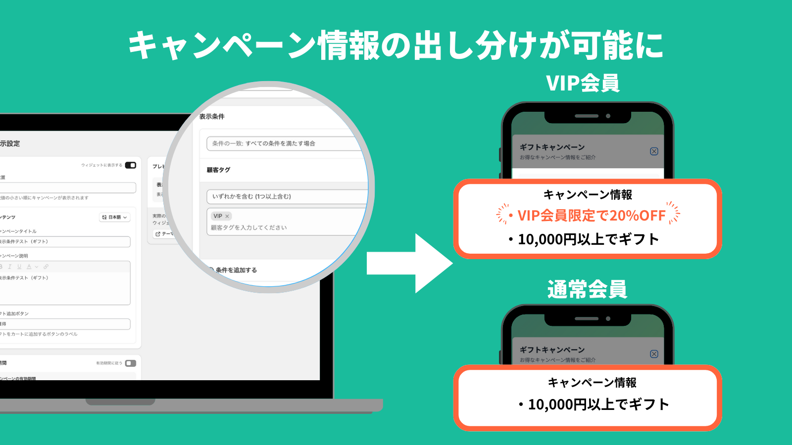 Campaign information can be displayed filtered by "specific conditions" or "Active dates." This enables more strategic sales promotion, such as pre-announcements or exclusive guidance for loyal customers.