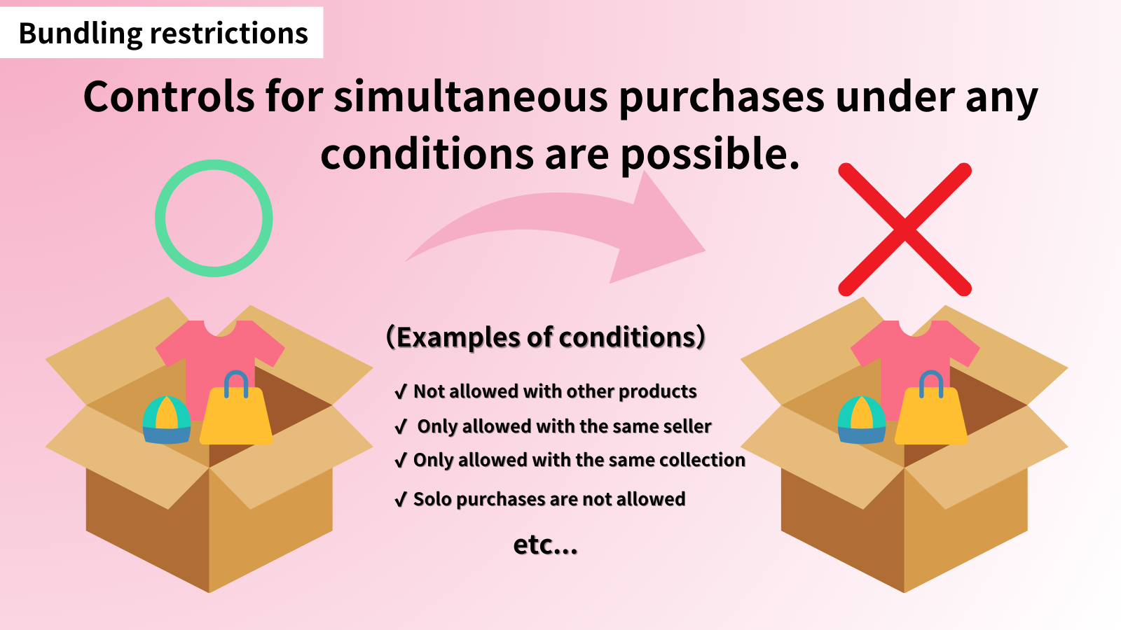 You can choose from three types of restriction scopes: variant level, product level, and collection level. By combining these restriction scopes, you can implement more flexible purchase restrictions.