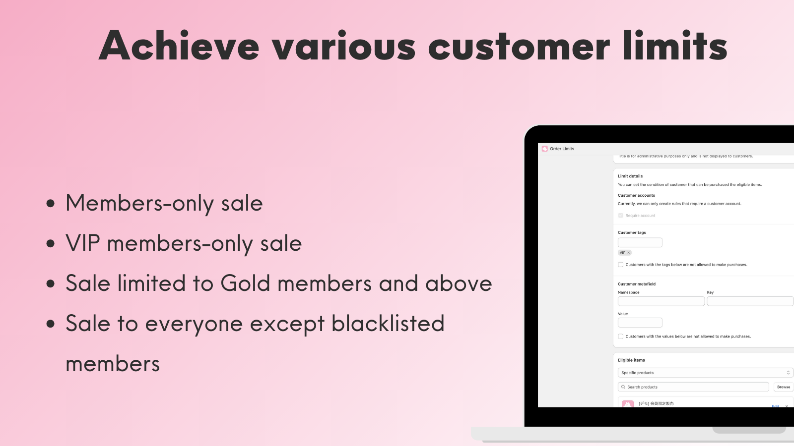 Various customer restrictions can be set based on conditions such as customer tags and customer metafields.