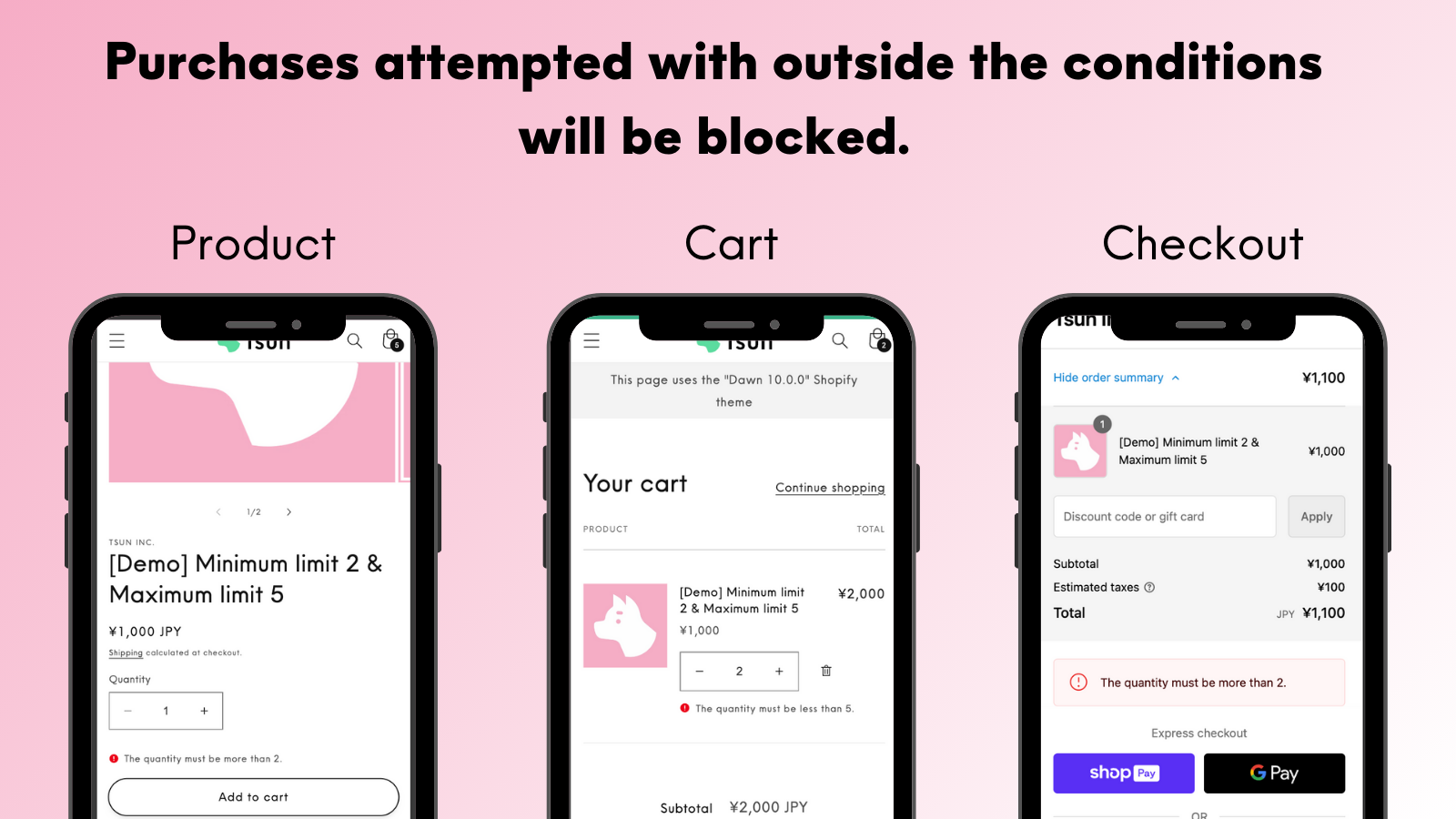The app can prevent orders that don't meet the set conditions. It blocks unintended orders at various points including product pages, cart, and checkout pages.