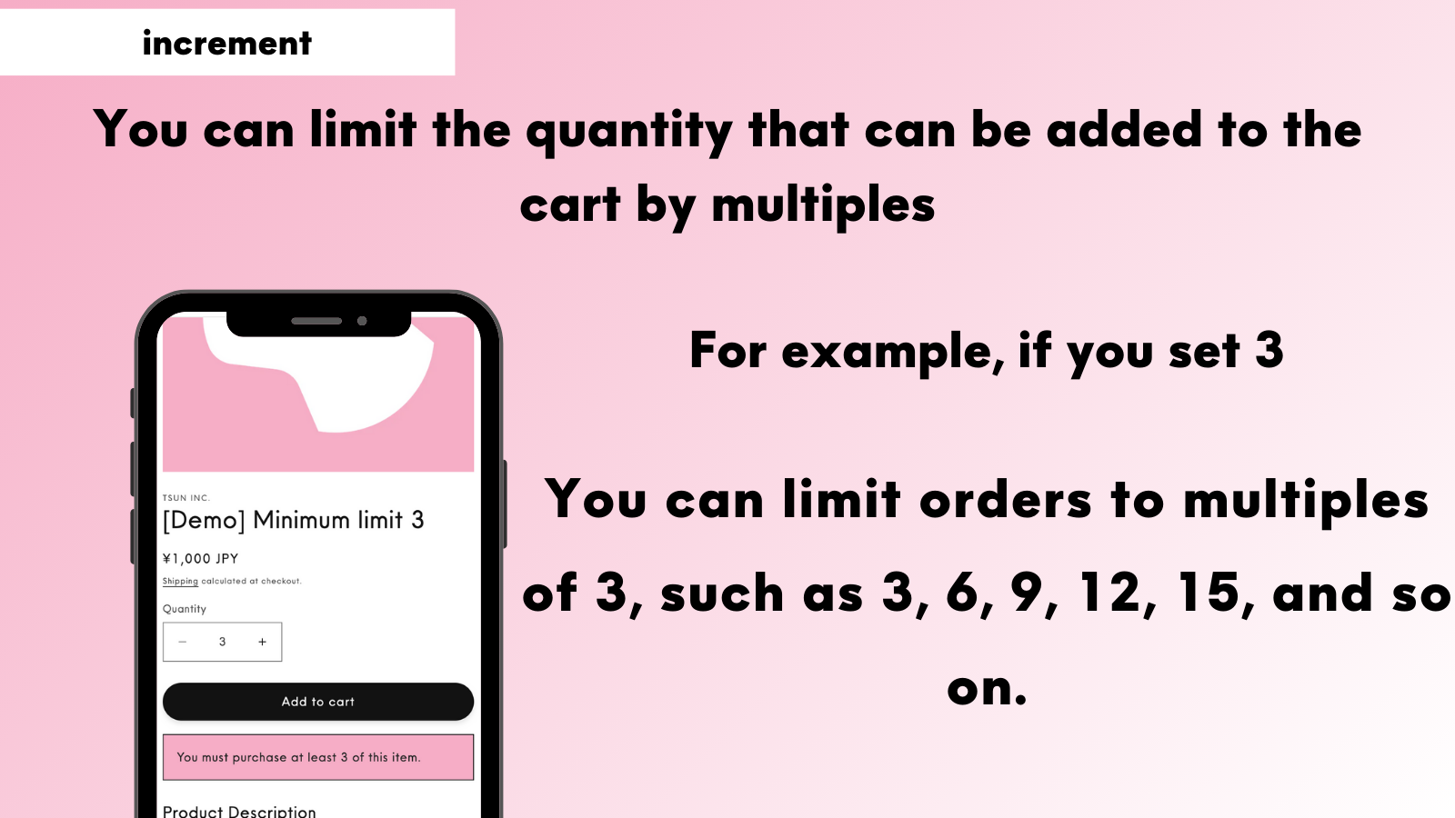 You can limit the quantity added to cart by multiples. For example, if you set it to 3, orders can only be placed in multiples of 3, such as "3, 6, 9, 12, 15..."