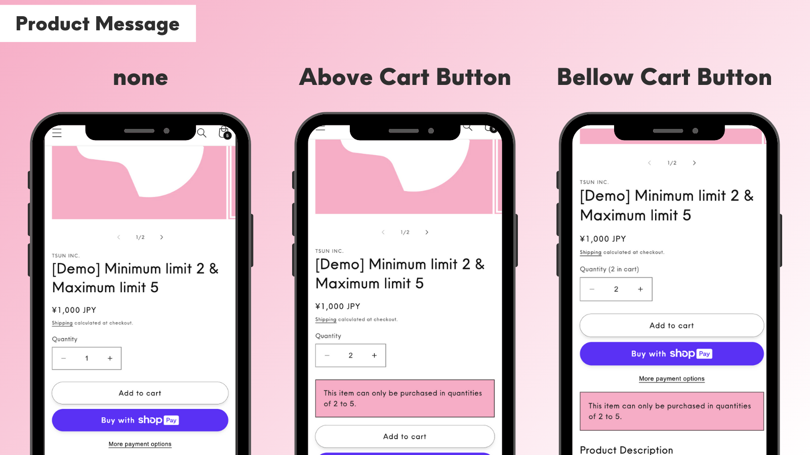 You can display custom messages on products with purchase restrictions. The message position can be toggled between above or below the cart button.