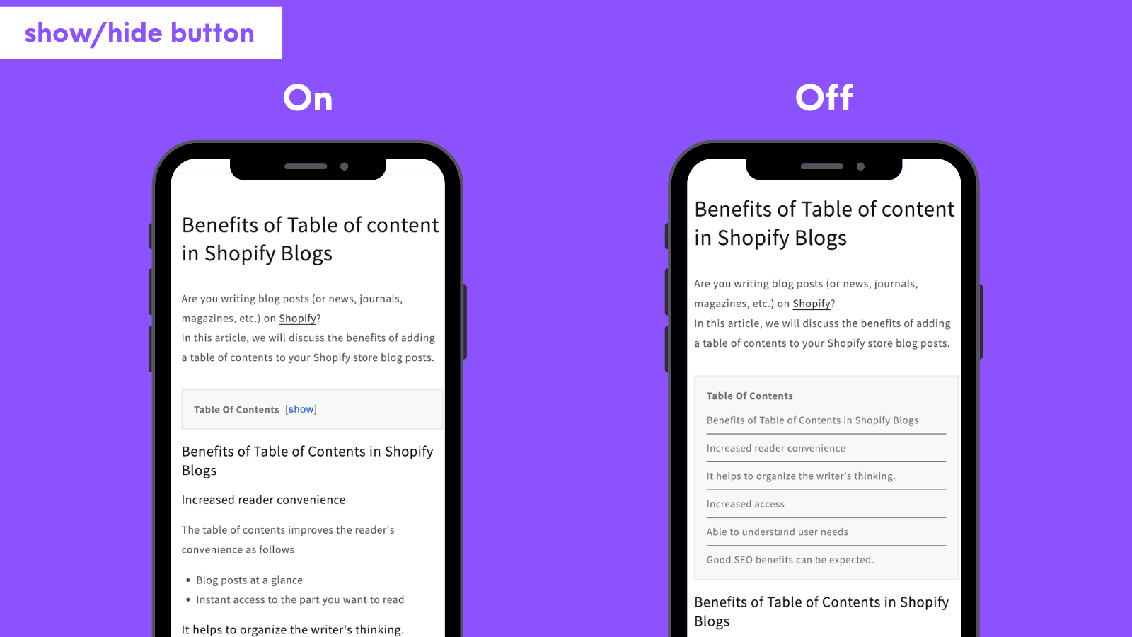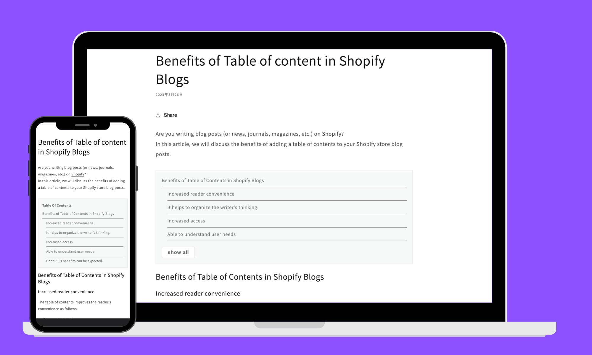 Can automatically generate and display a table of contents using headings from content such as blog posts, products, pages, and collections.