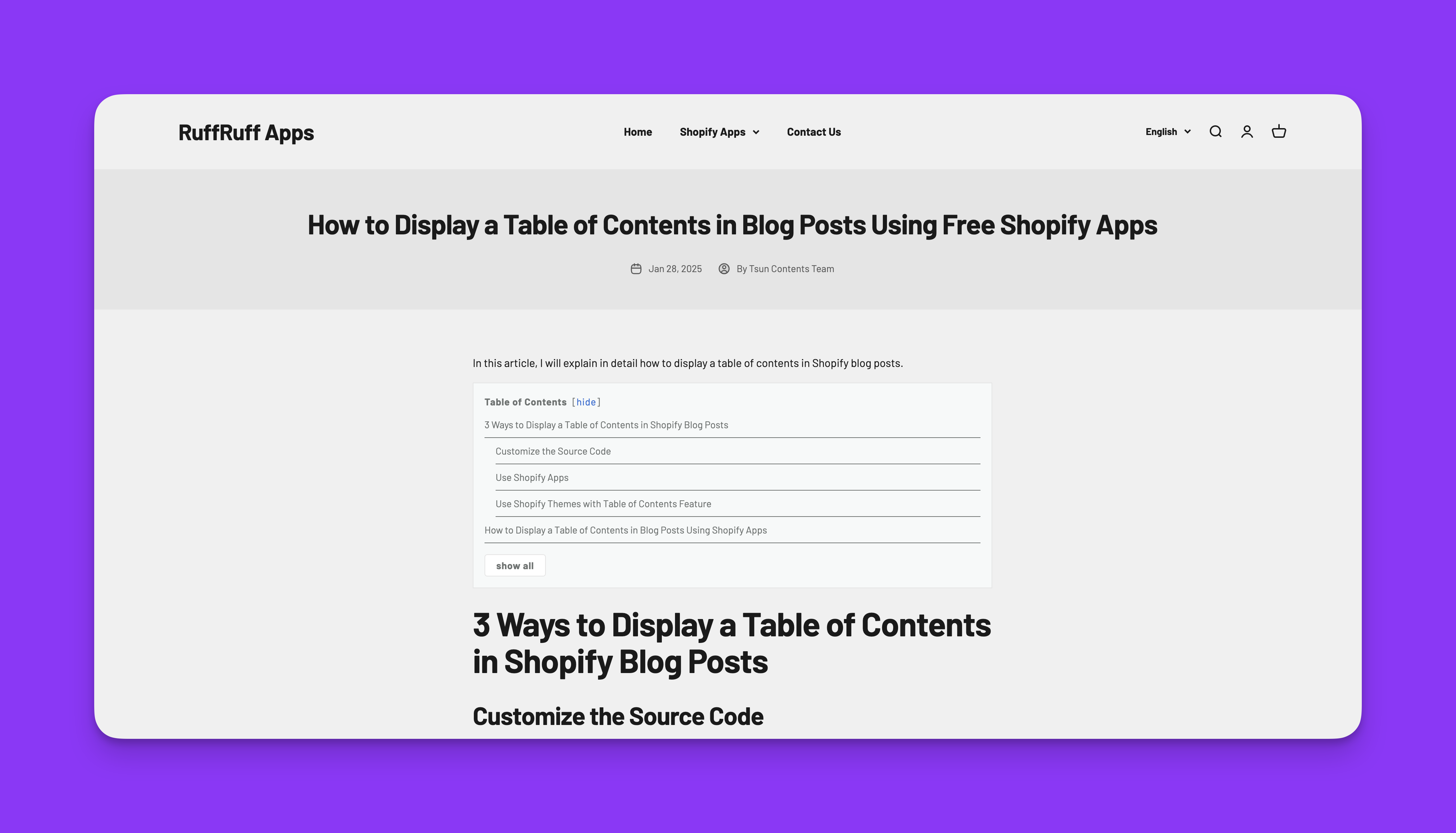 Learn three methods to display a table of contents in Shopify blog posts (source code customization, app usage, theme usage). Step-by-step instructions focus on setup using the free app RuffRuff Ta...