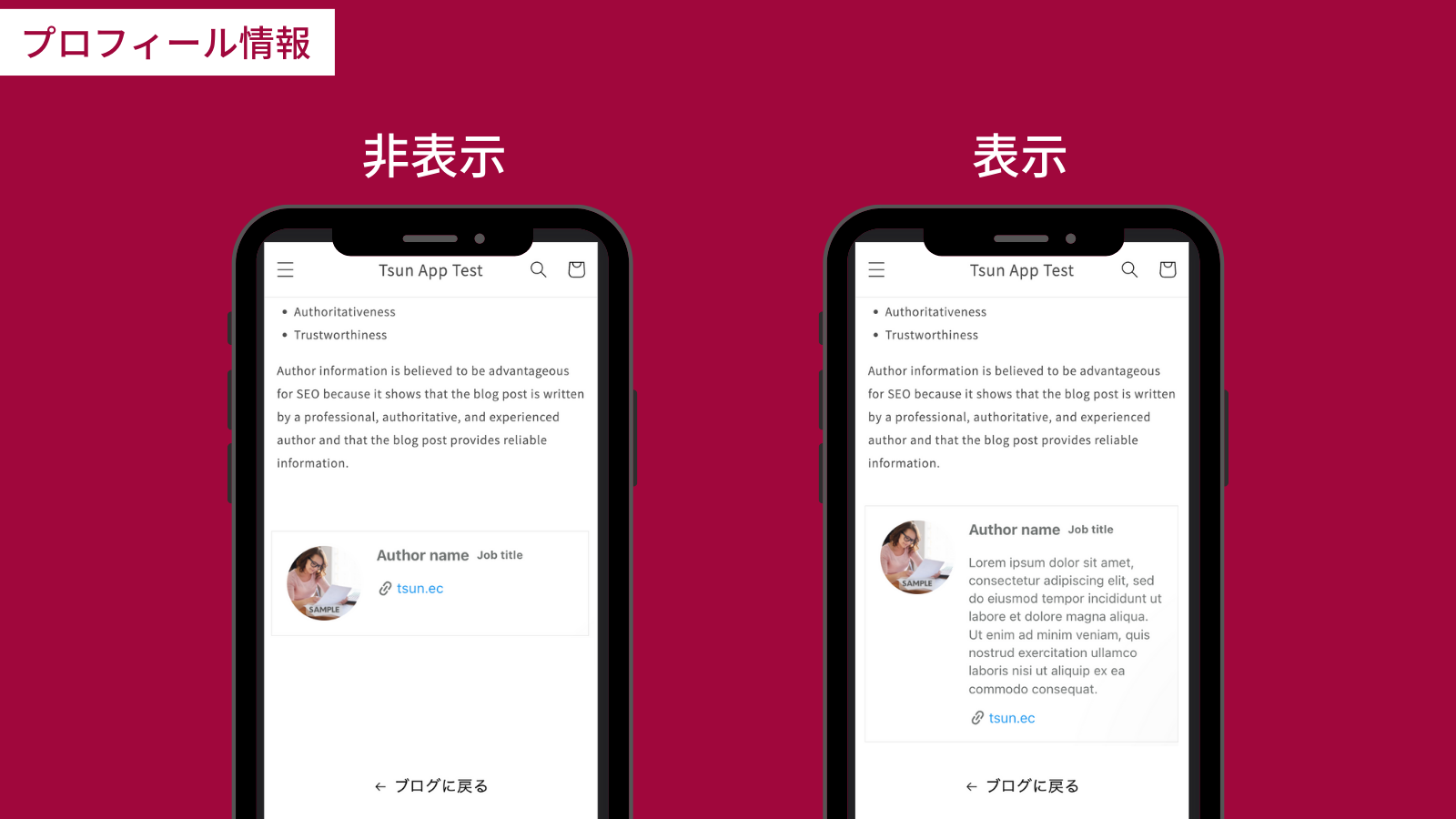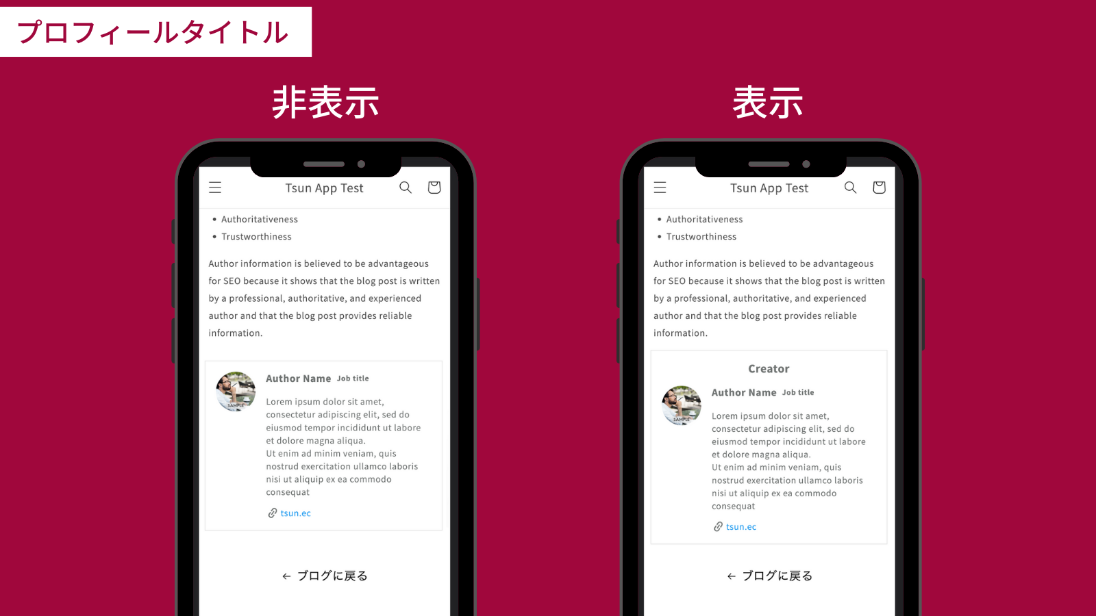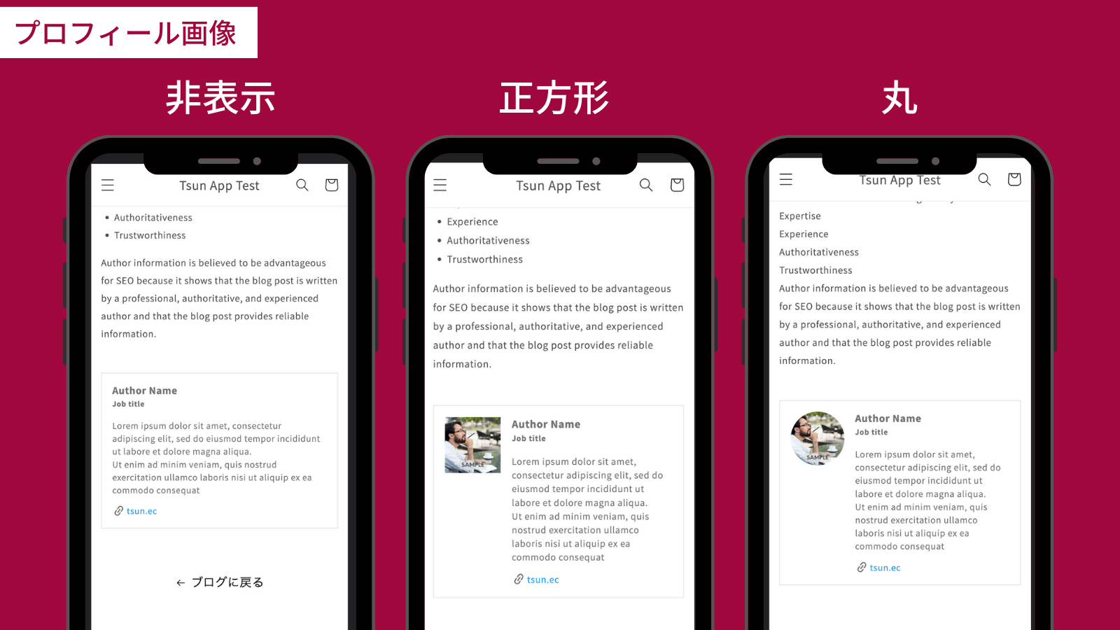 Shopifyでは著者名しか表示できません。アプリを利用することで、著者名以外にプロフィール画像やプロフィール情報、肩書などの情報を表示できます。