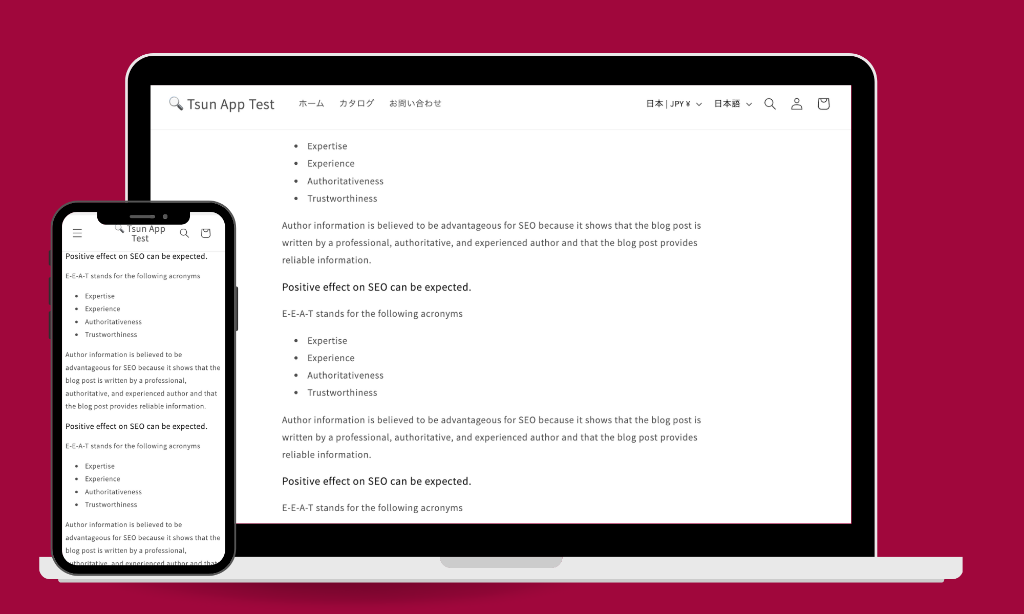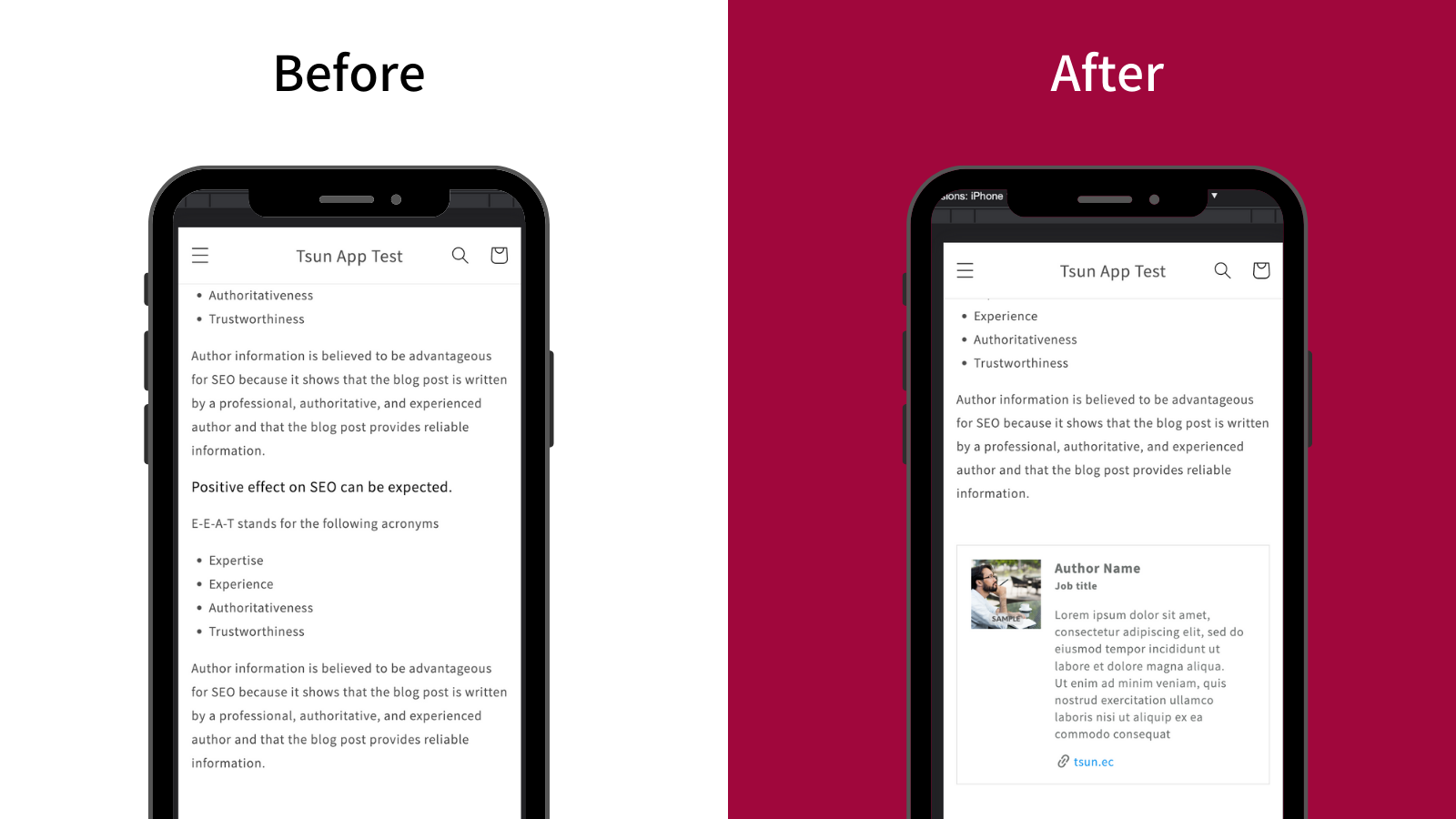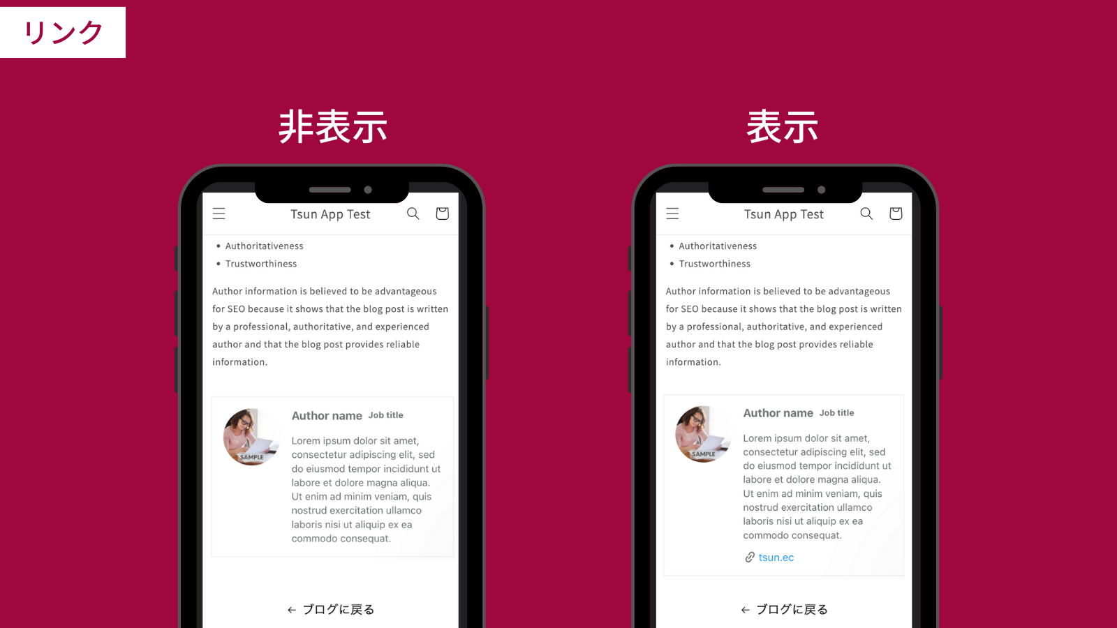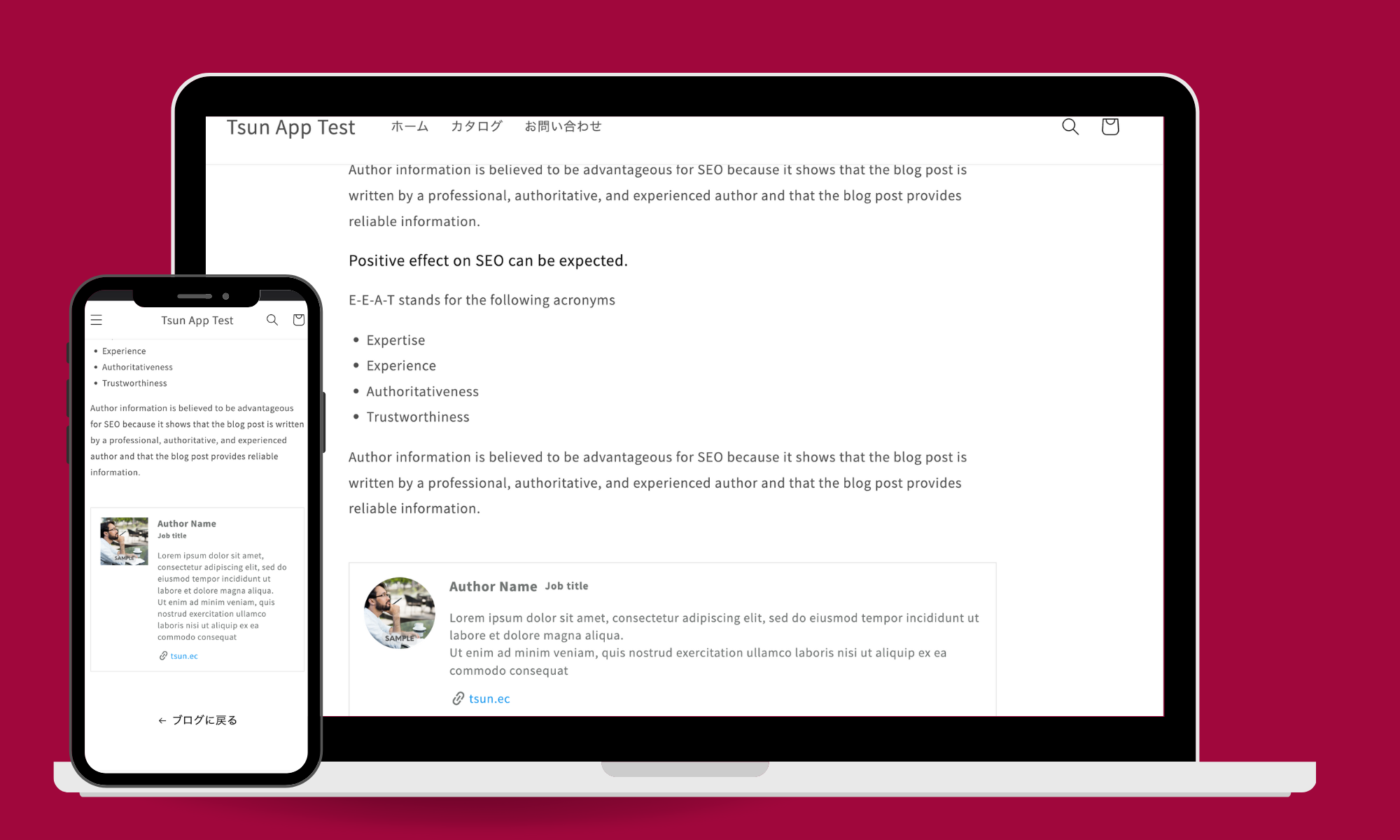 Shopifyでは著者名しか表示できません。アプリを利用することで、著者名以外にプロフィール画像やプロフィール情報、肩書などの情報を表示できます。
