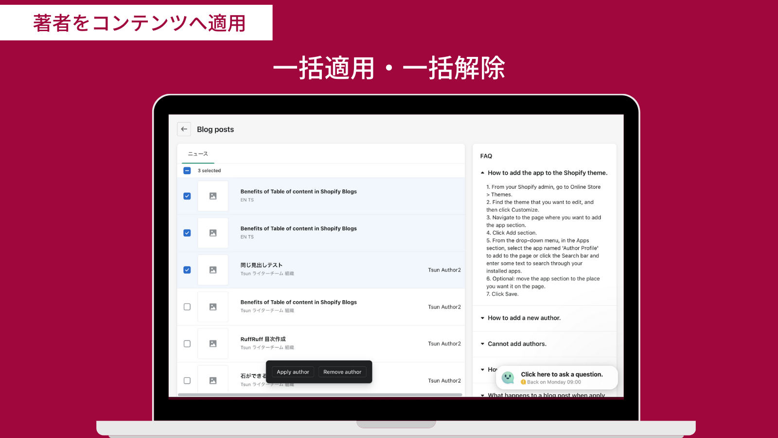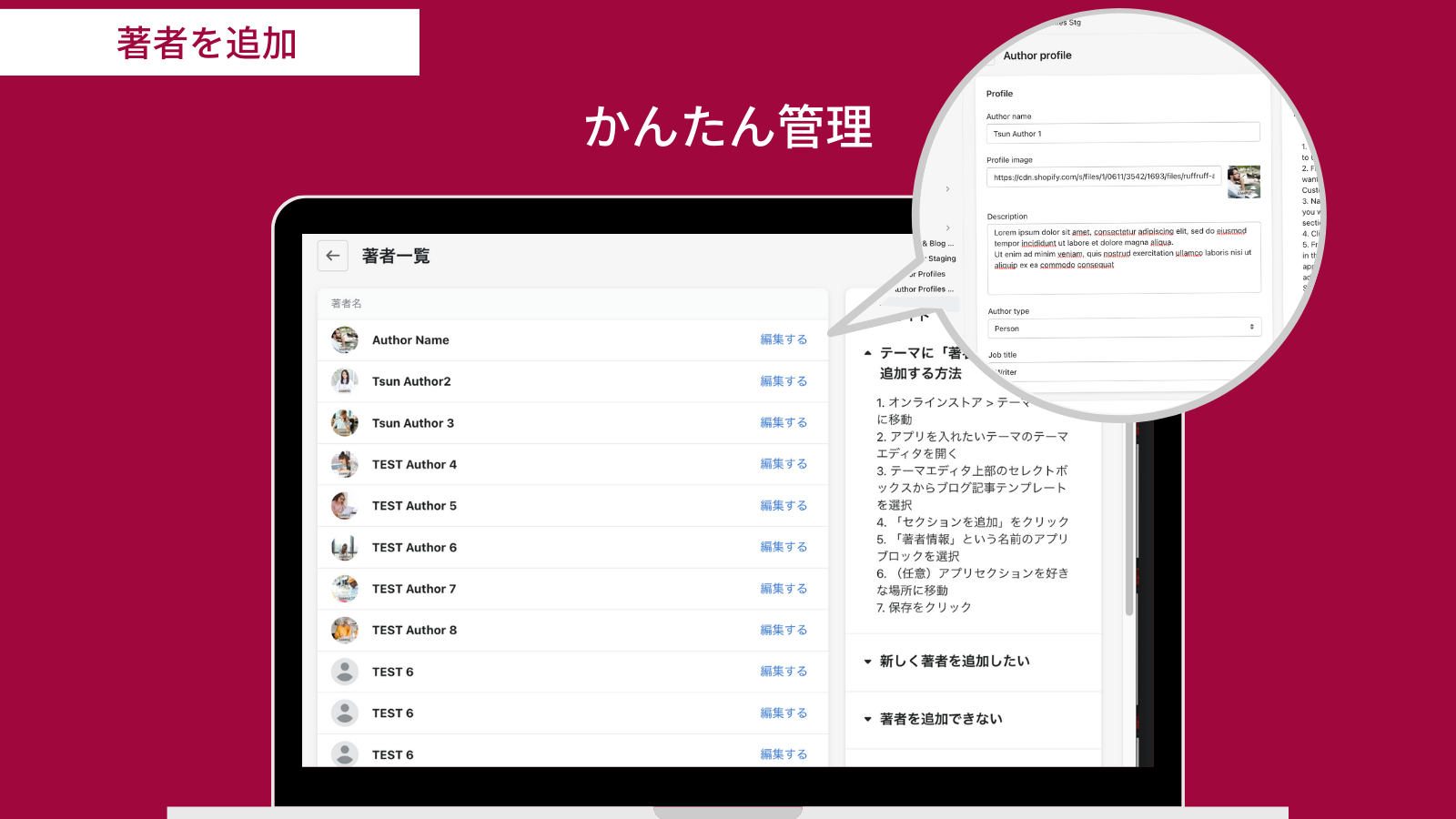 Shopifyで設定できる著者は、登録しているスタッフの人数分しか設定できません。アプリを利用することで、スタッフ人数以上の著者を登録することができます。※ 登録できる人数はプランに応じて変動します。