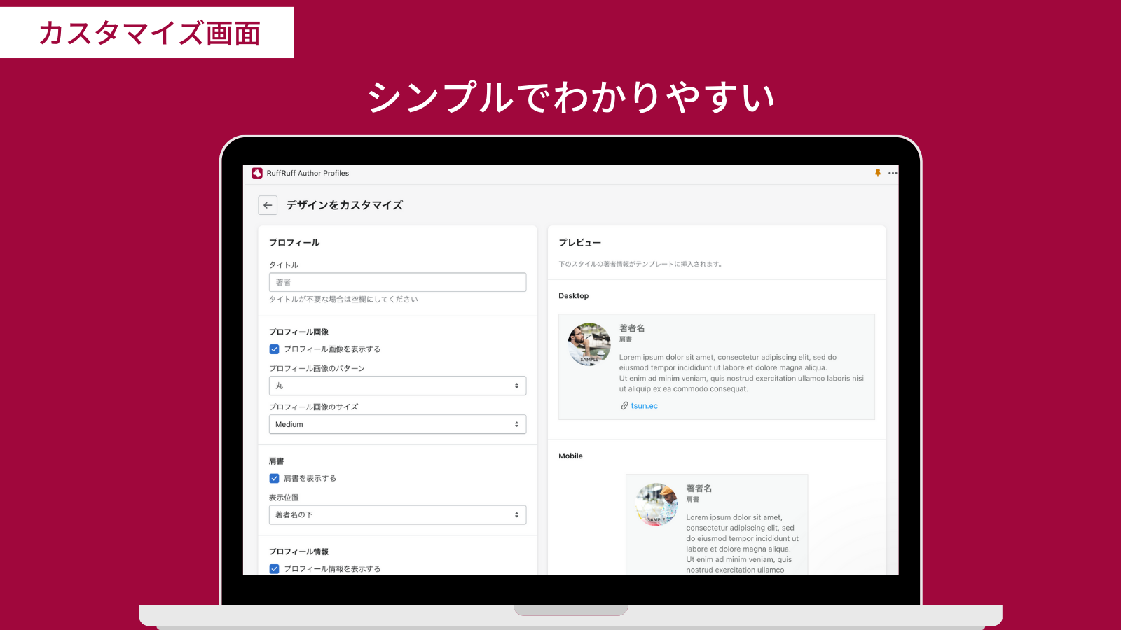 アプリを利用することで、ブログ記事などのコンテンツに著者情報などのプロフィールを表示することが出来ます。