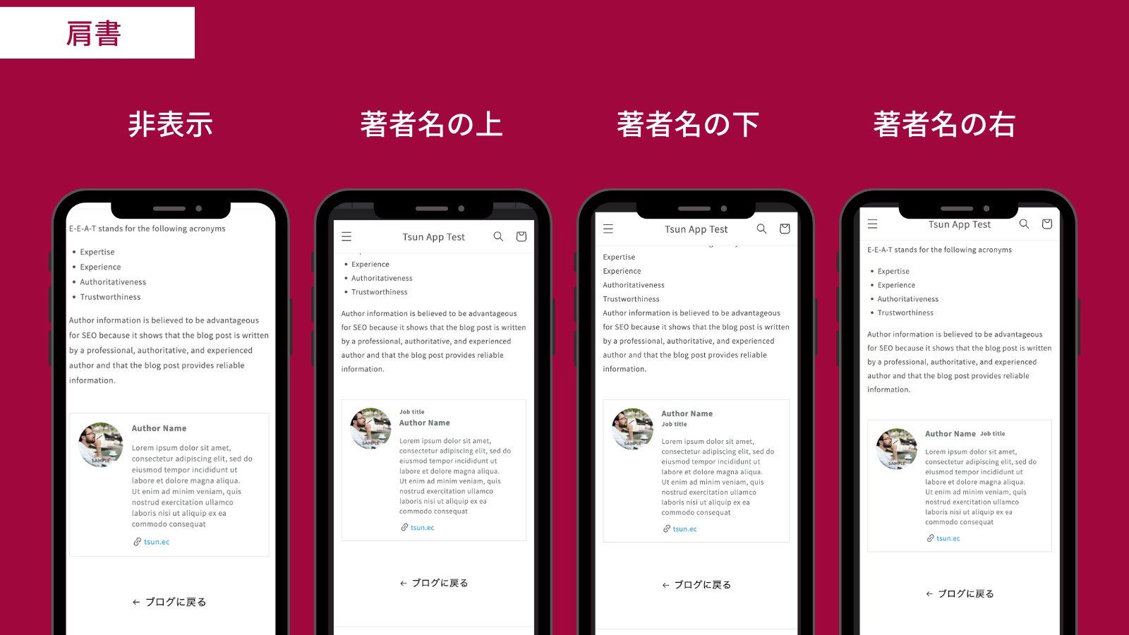 プロフィール情報に肩書を設定できます。肩書情報の表示位置も「著者名の上」「著者名の下」「著者名の右」の3種類から選ぶことができます。