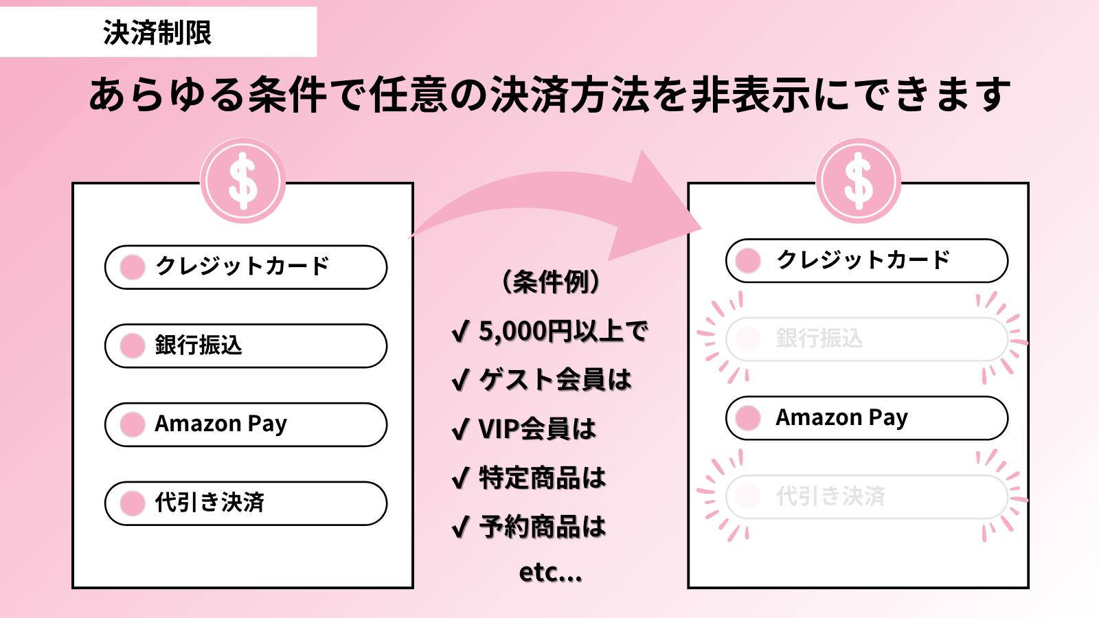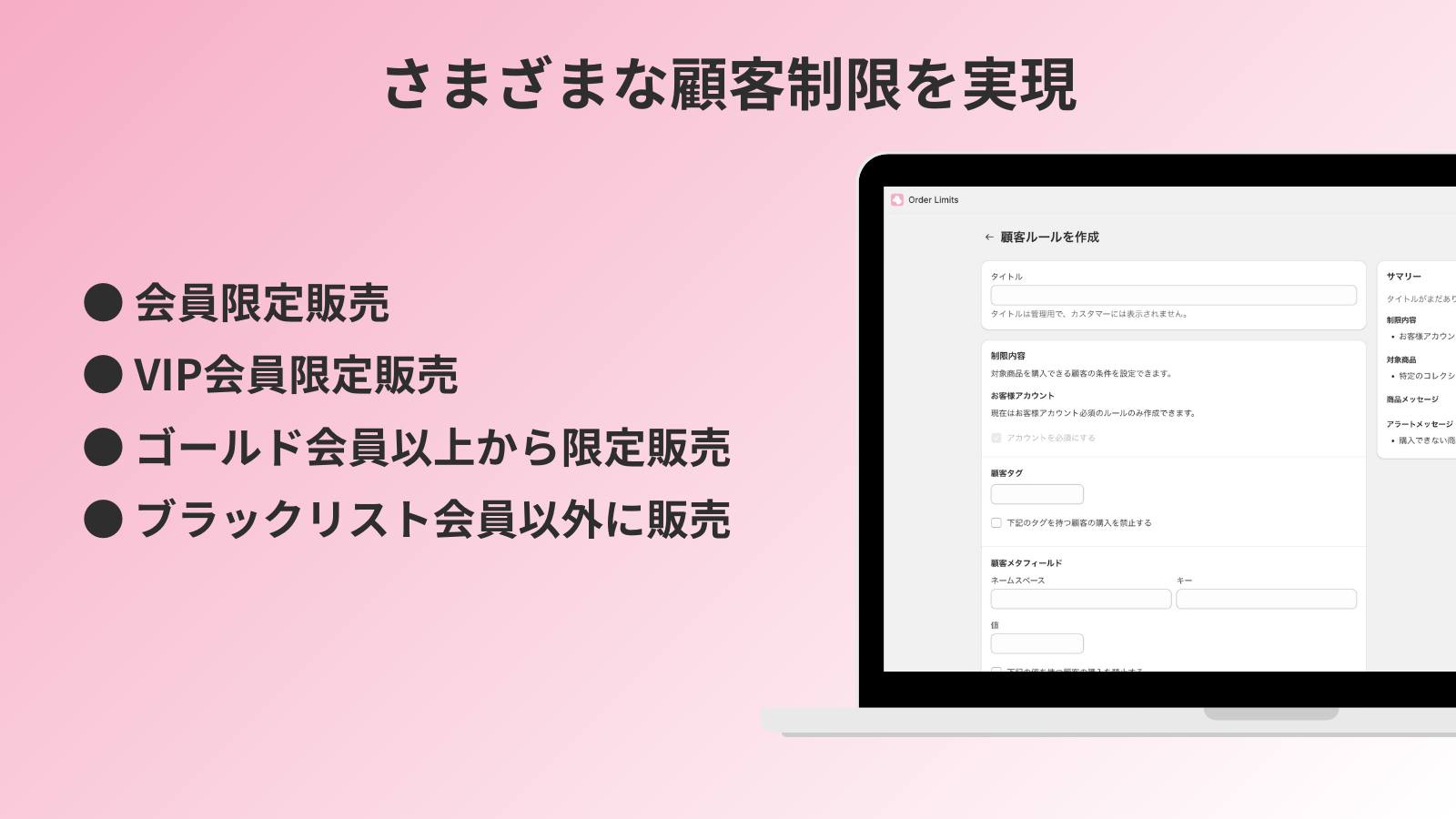顧客タグや顧客メタフィールドなどさまざまな条件に応じた顧客制限が設定可能です。