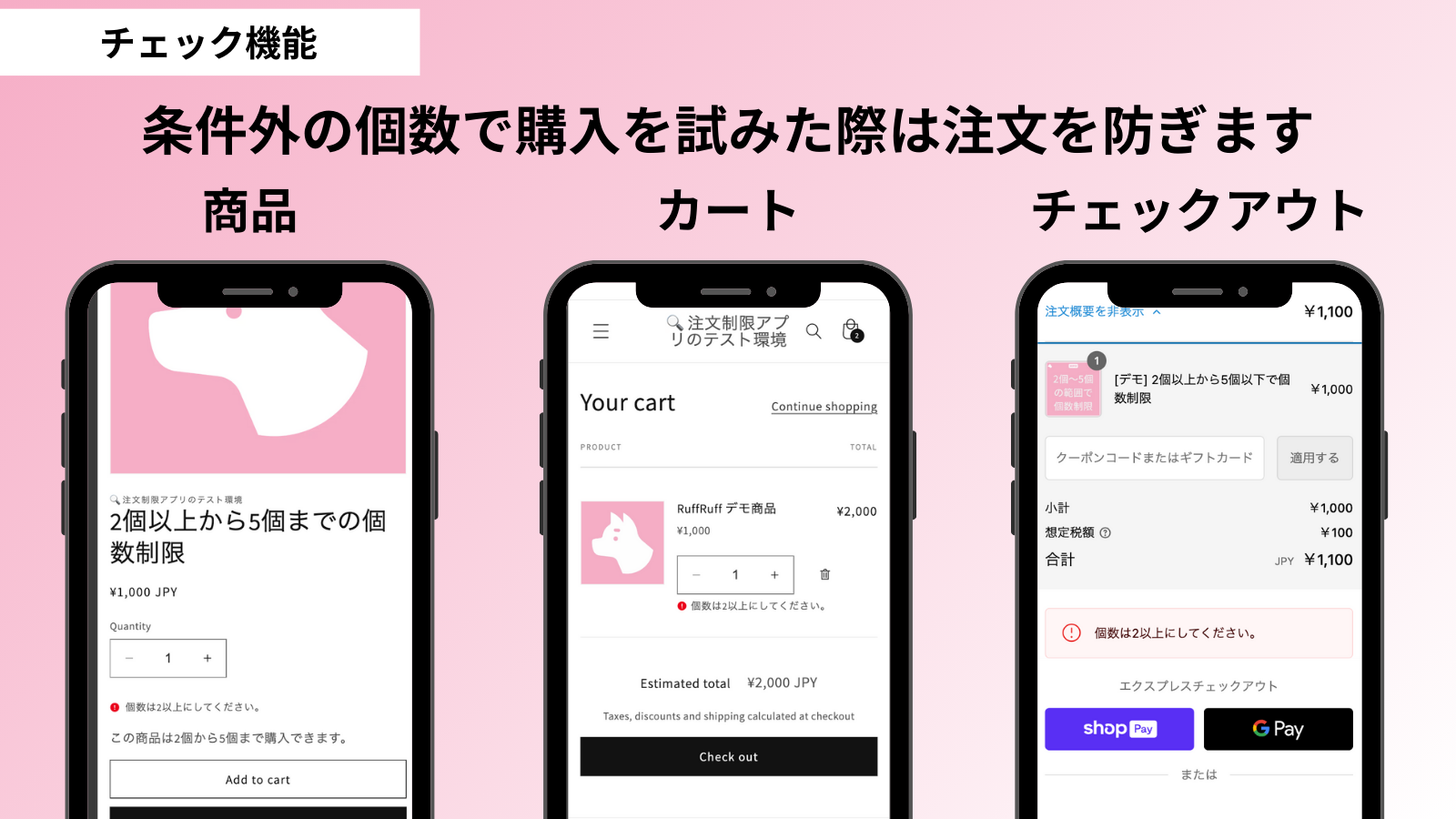 アプリで設定した条件外の注文を阻止することが可能です。商品やカート、チェックページなどあらゆる場所で、意図しない注文を阻止します。
