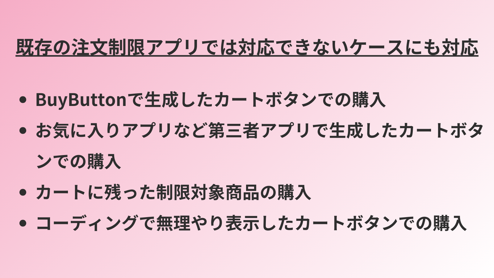 従来のアプリでは対応が難しい、意図しない注文の防止が可能になります。例えば、BuyButtonで生成されたカートボタンを使用しての購入や、お気に入りアプリなどの第三者アプリによって生成されたカートボタンを介した購入。また、コーディングによって強制的に表示されたカートボタンからの購入など、さまざまな不正や不適切な購入を防ぐことができます。