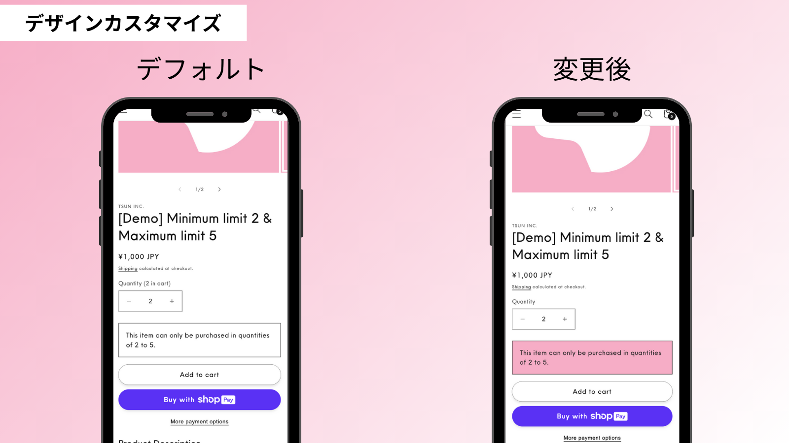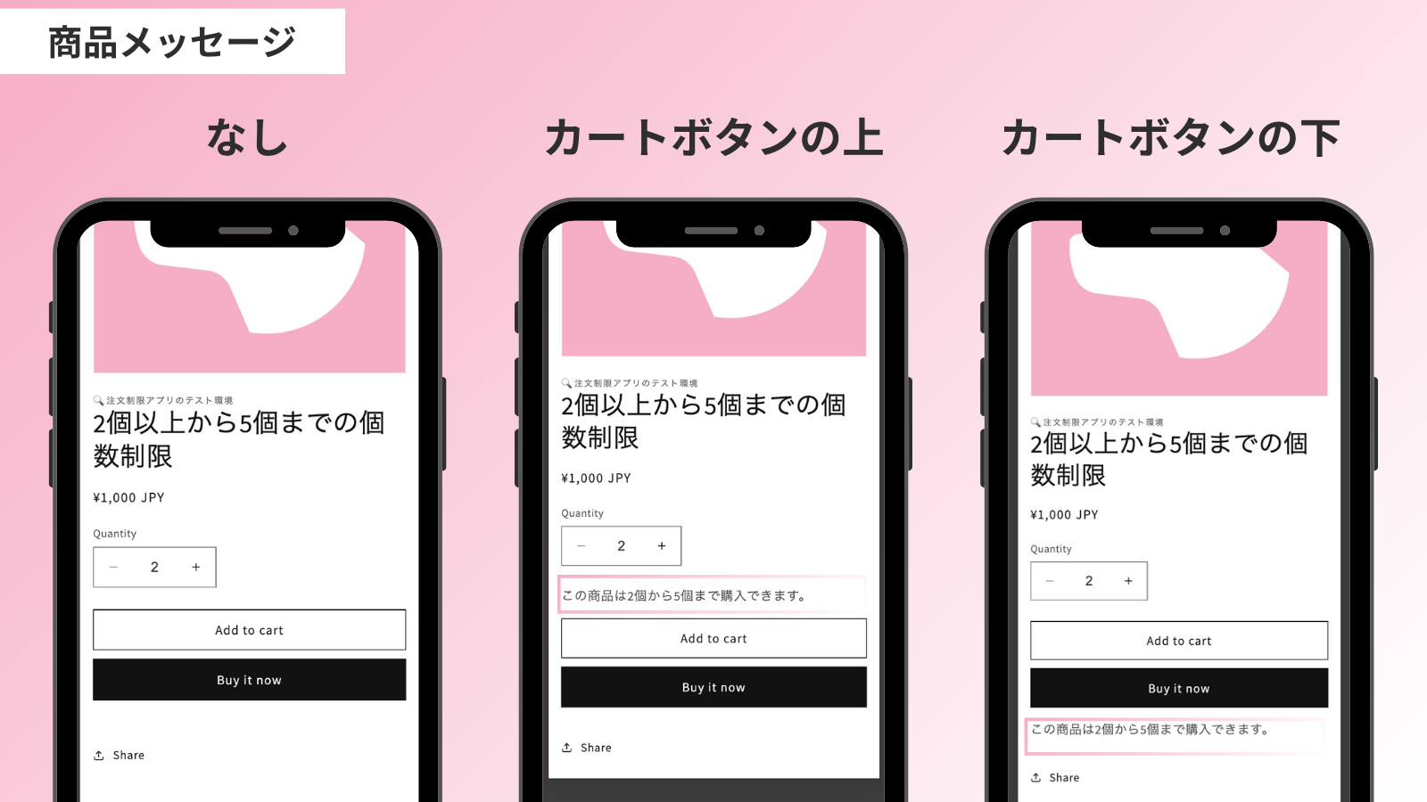 購入制限を実施している商品に任意のメッセージを表示することができます。また、メッセージの表示位置は、カートボタンの上部または、下部と切り替え可能です。