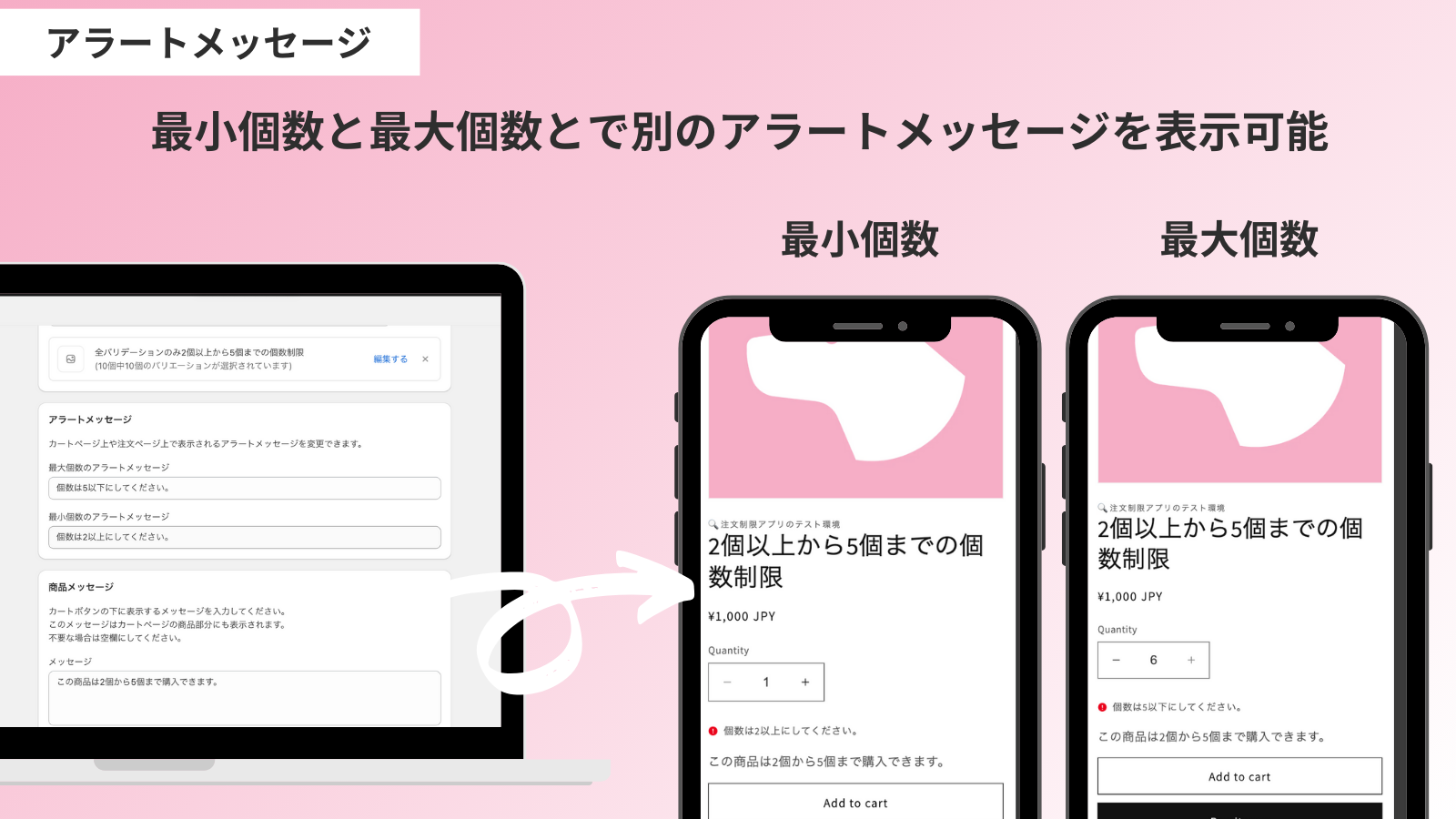 アプリで設定した条件外の注文を阻止することが可能です。注文を阻止した場合にお客様へ表示するアラートメッセージもカスタマイズできます。