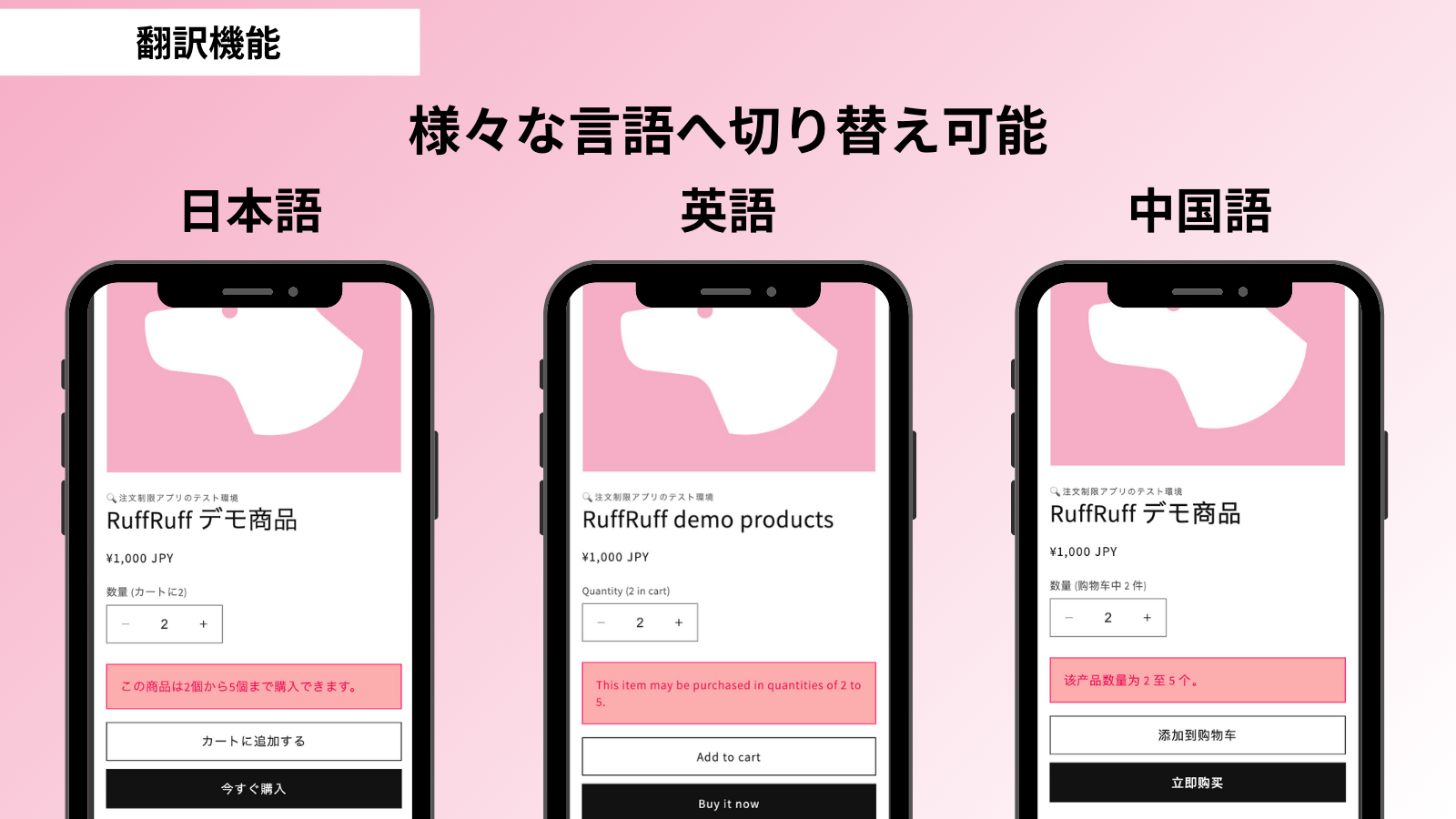 アプリ内で設定可能な商品メッセージやアラートメッセージなど、すべてのテキストデータを翻訳対応できます。これにより、越境販売を行う際も、ユーザーの言語に合わせて自由に切り替えることが可能です。
