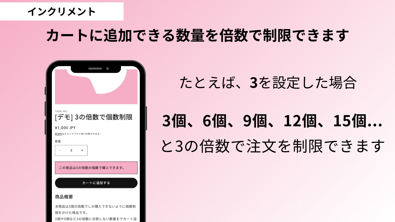 カートに追加できる数量を倍数で制限できます。たとえば、3を設定した場合は、「3個、6個、9個、12個、15個...」と3の倍数で注文を制限できます。