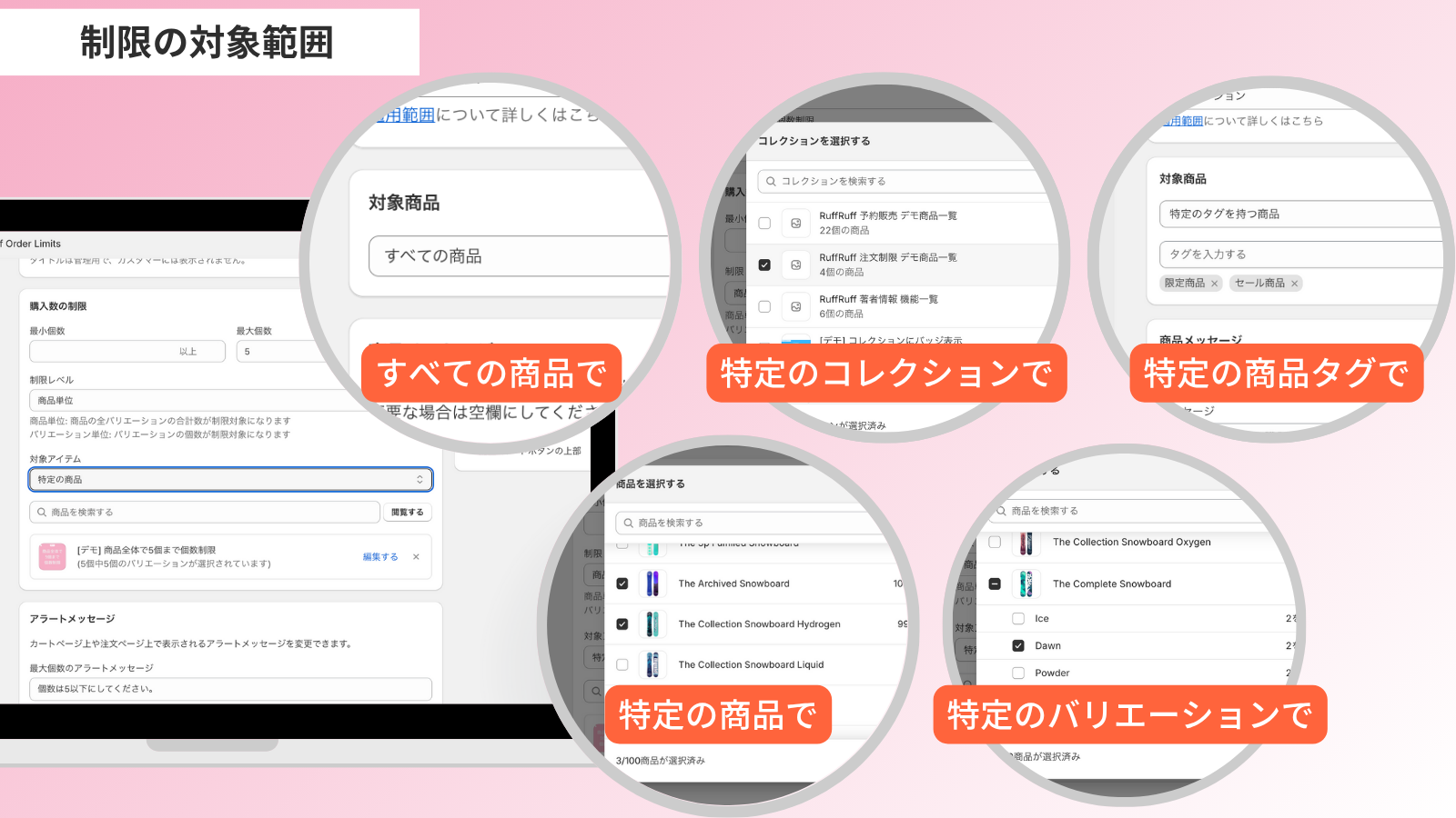 購入制限の範囲を全ての商品、コレクション、商品、バリエーション、商品タグから選ぶことができます。